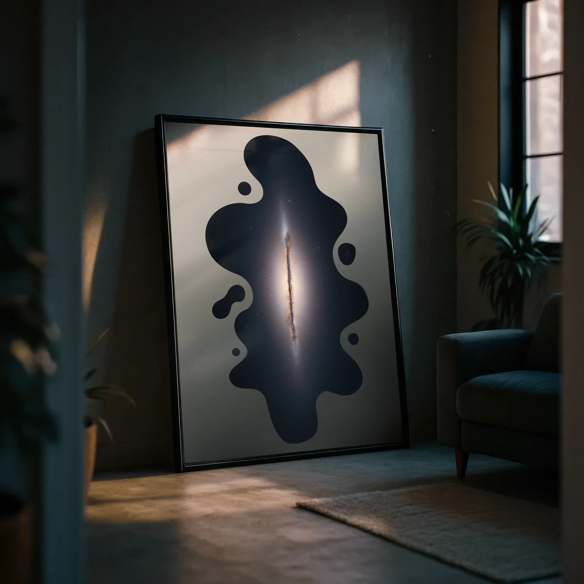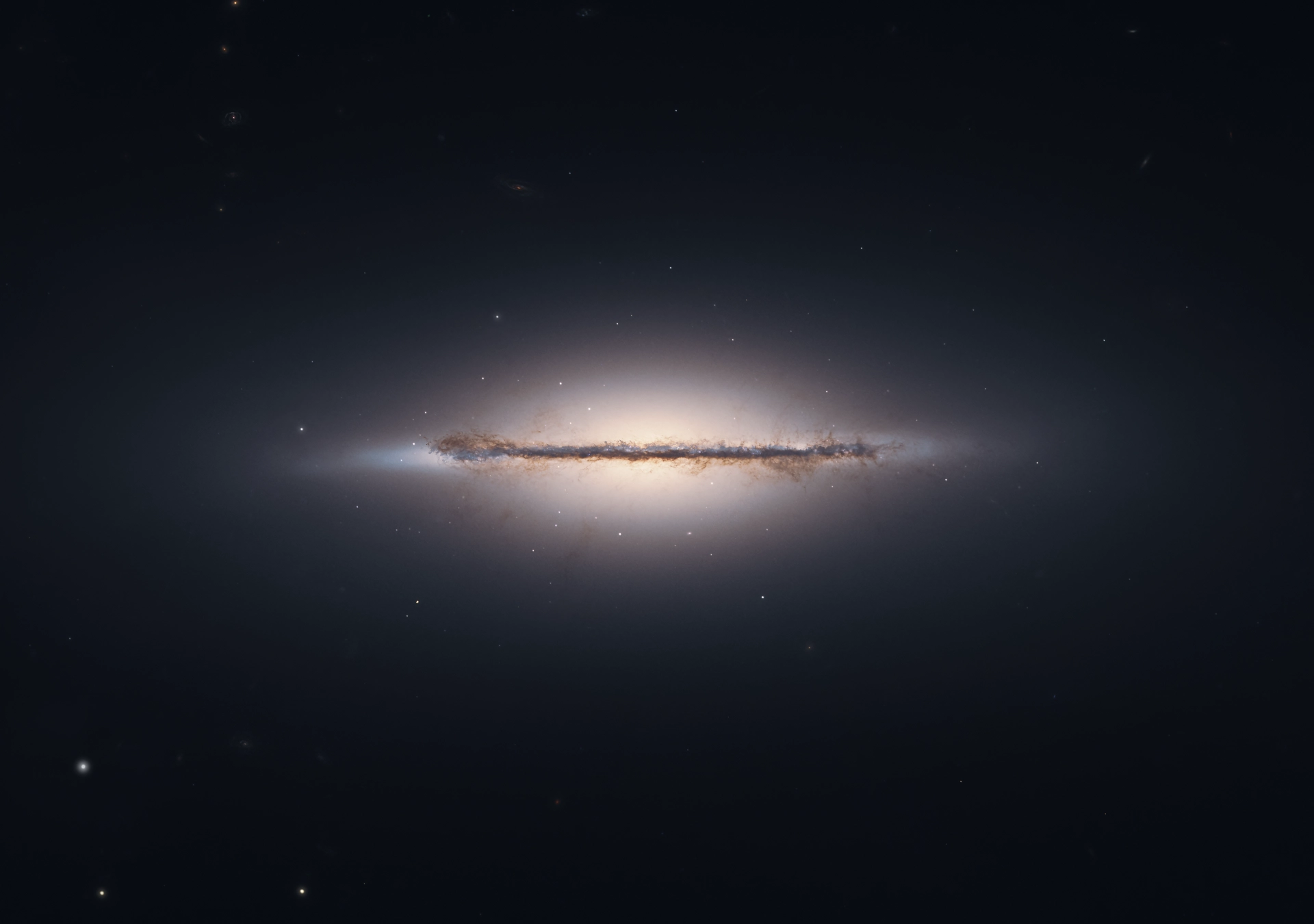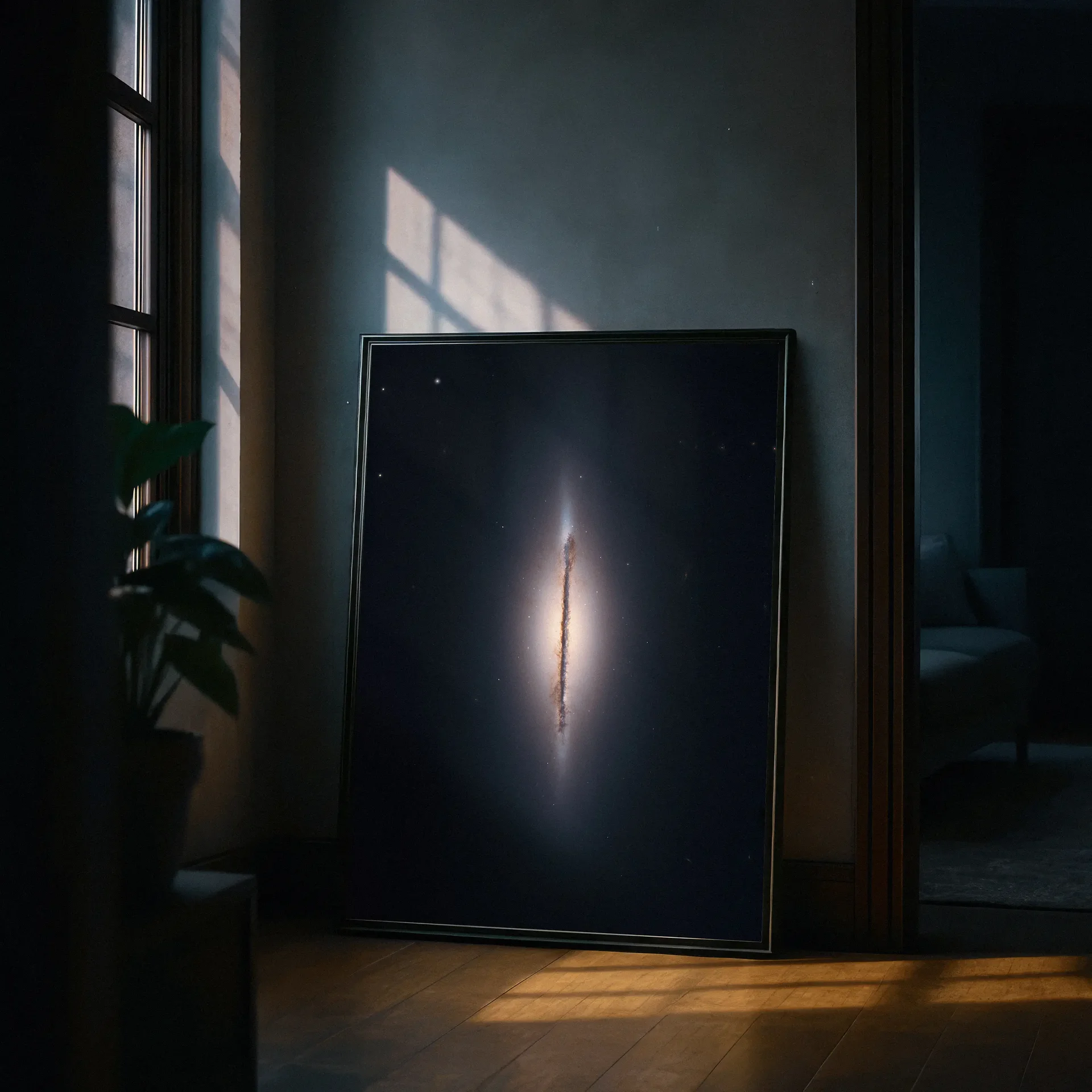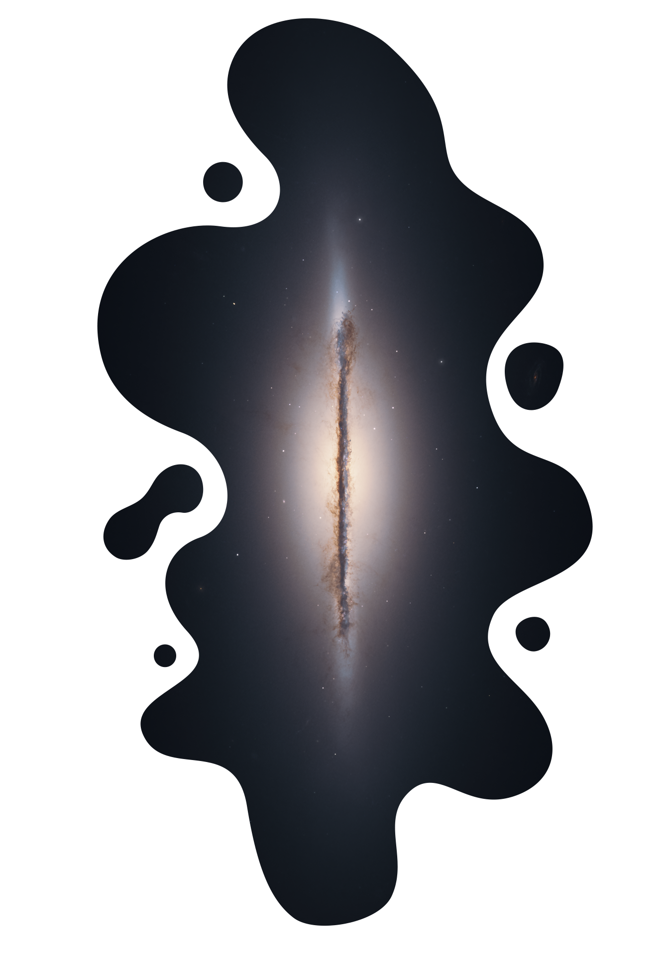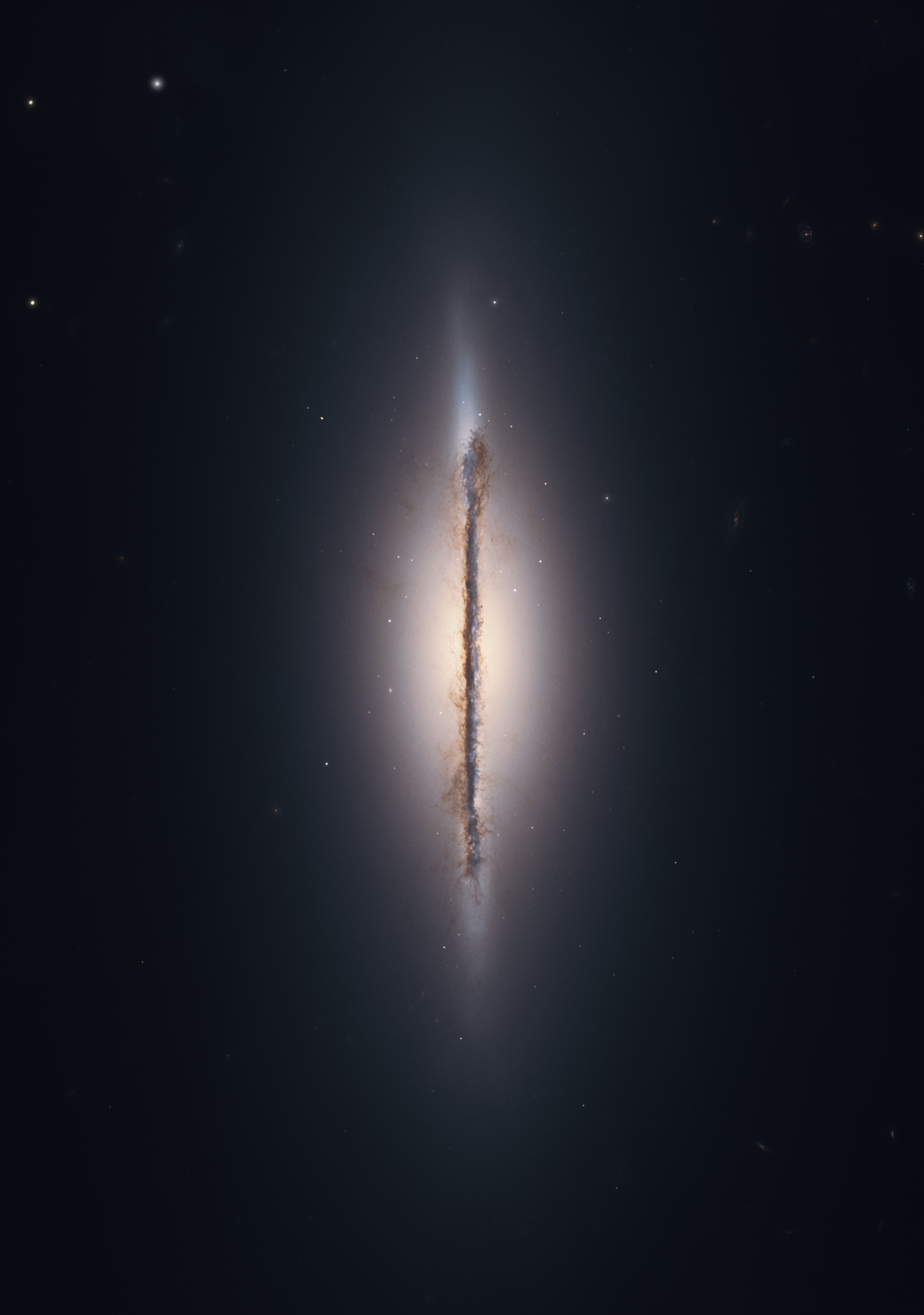 eine zarte, linsenförmige Galaxie aus Milliarden Sternen, Staub und Zeit, die sich wie ein schwebender Silberstreif durchs All zieht. Ihr dünnes Staubband teilt sie wie ein Pinselstrich in zwei Hälften. Sterne, Gas und Staub kreisen dort seit Milliarden Jahren umeinander und formen eine gleichmäßige Struktur inmitten des Chaos des Kosmos. Von der Erde aus sehen wir sie genau von der Seite: ein schmaler Lichtstreifen – scharf, kühl, fast minimalistisch.
