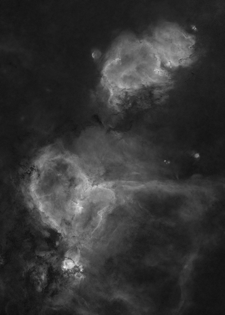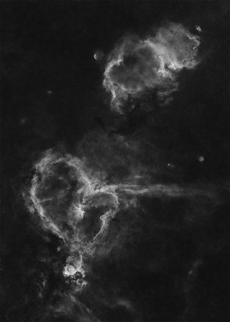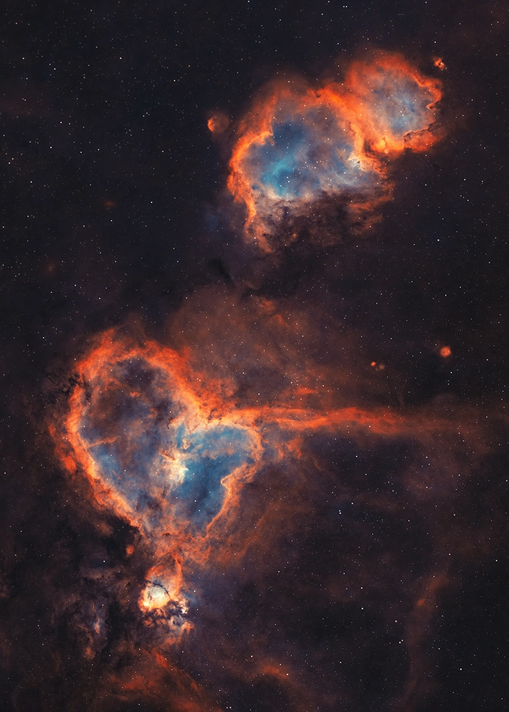 Ein Bild das nicht erklärt werden muss: Herz & Seelennebel - Zwei gigantische Wolken aus Gas und Staub im leeren Raum. Sie formen neue Sterne, während sie selbst langsam zerfallen. Am Himmel sind sie wesentlich größer als der Mond - und trotzdem für das Auge unsichtbar. Erst durch Astrofotografie zeigen sie ihre Strukturen, leuchtend, detailreich, fast überirdisch.